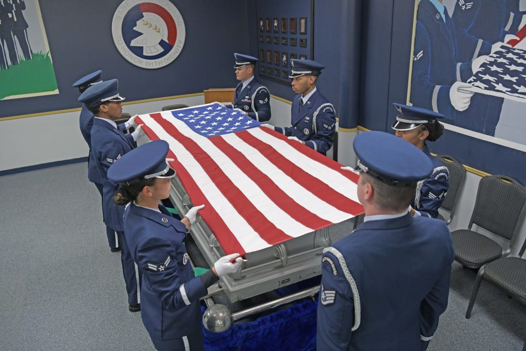 ROBINS AIR FORCE BASE, Ga. – Robins Honor Guard pallbearers drape a flag over the casket during a funeral detail practice at Robins Air Force Base, Georgia, Dec. 12, 2024. The honor guard flight performed nearly 2,000 funerals this year. (U.S. Air Force photo by Kisha Foster Johnson)