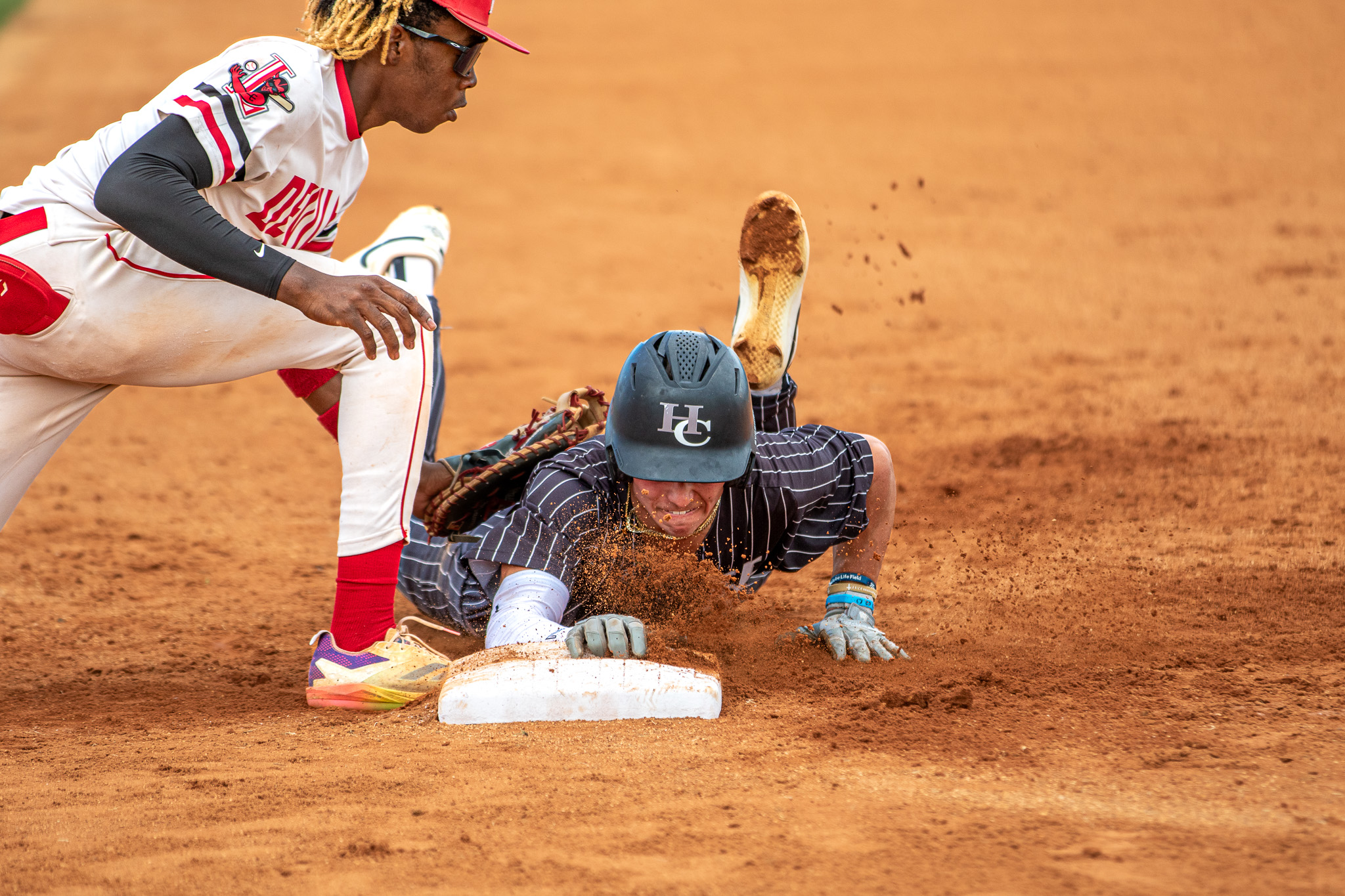 Kendall Jackson (black) slides back to first base during HoCo’s semifinals win over the Red Devils on Tuesday, May 13. (Clay Brown/HHJ)