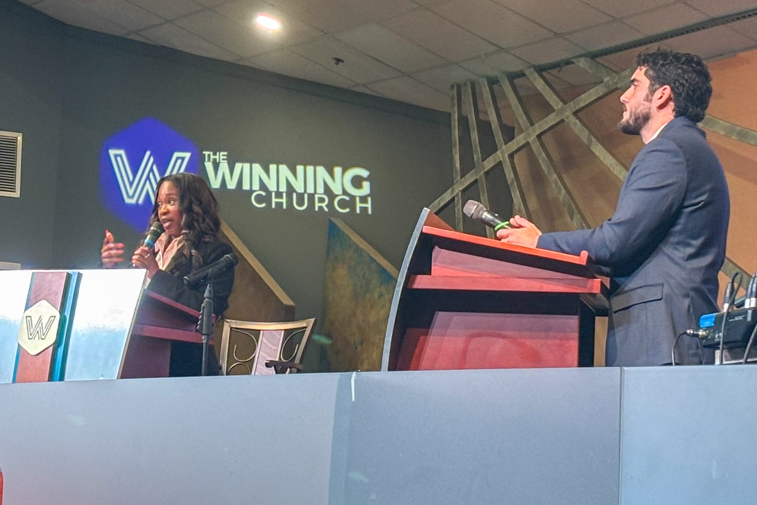 Mayor LaRhonda Patrick (left) and Fabian Velazquez (right) participate in a debate at the Winning Church on Thursday, Sept. 18. (Owen Jones/HHJ)