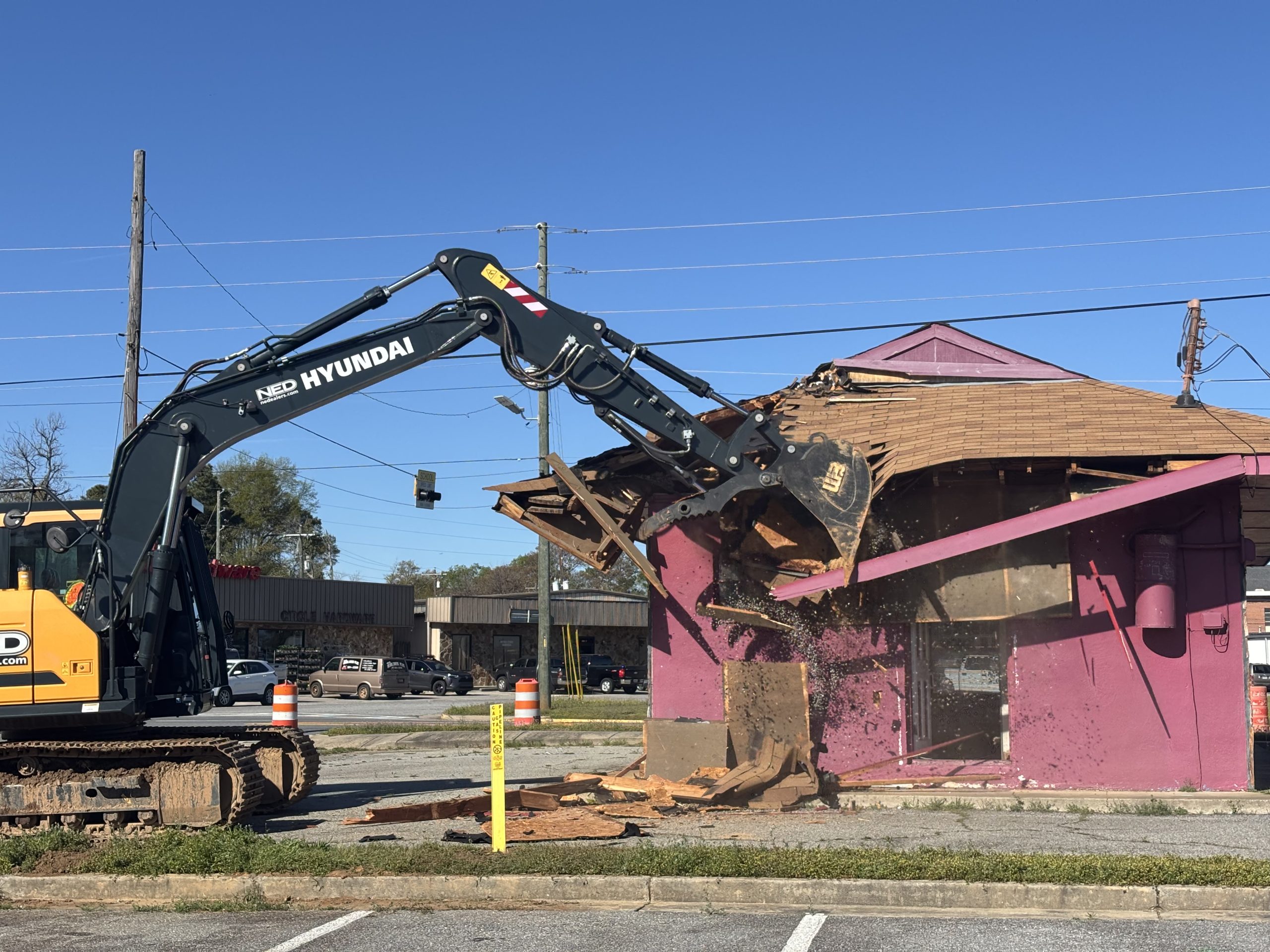 The City of Warner Robins Operation Reawaken results in demolishing a vacant property on Commercial Circle, Tina’s Barber and Style Shop, on Tuesday, March 25. (Owen Jones/HHJ)