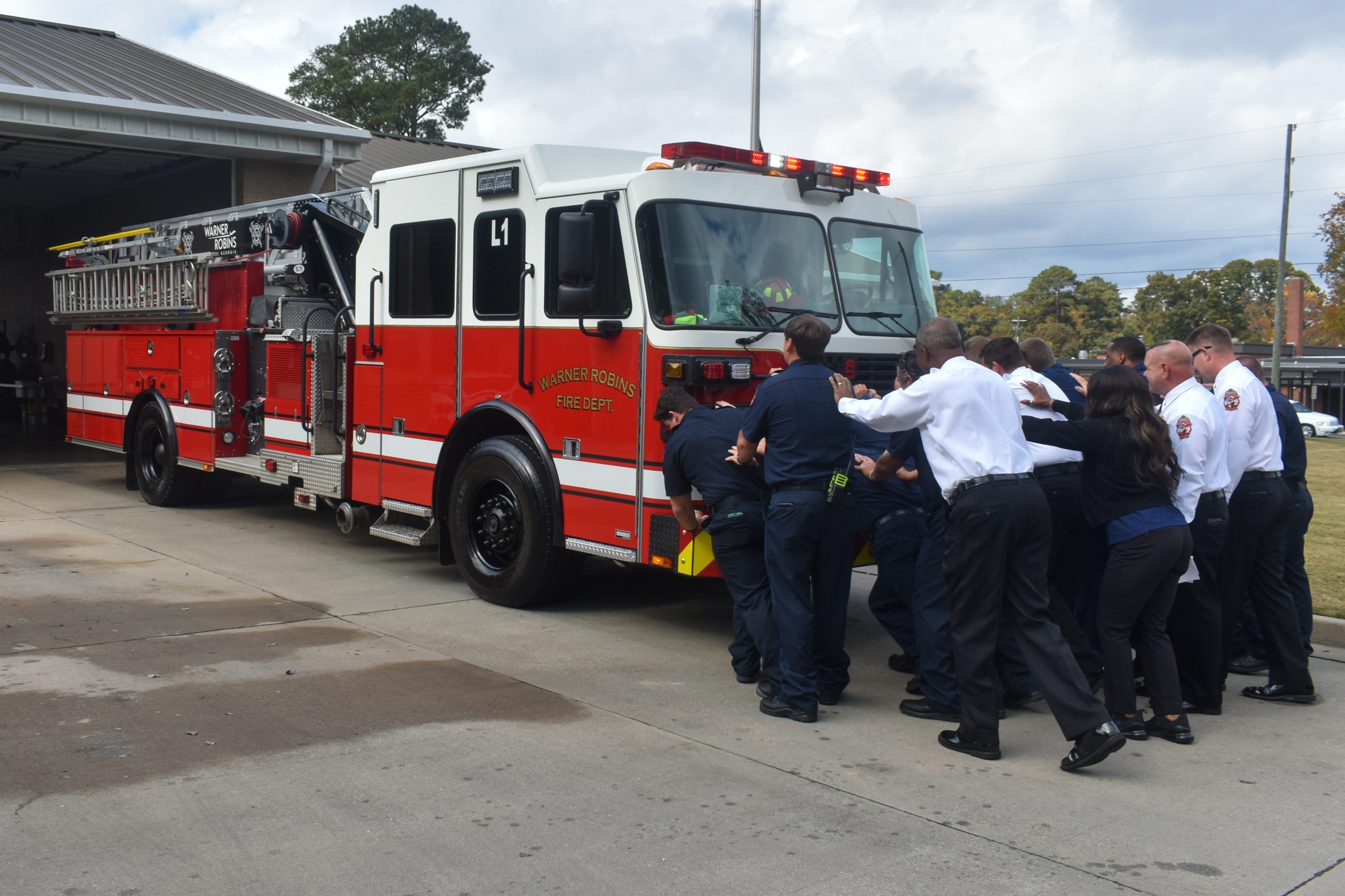 City leadership, fire department leadership and firefighters push in a 75-foot ladder truck during a ceremony at Warner Robins Fire Department Station One on Saturday, Nov. 8. (Brieanna Smith/HHJ)