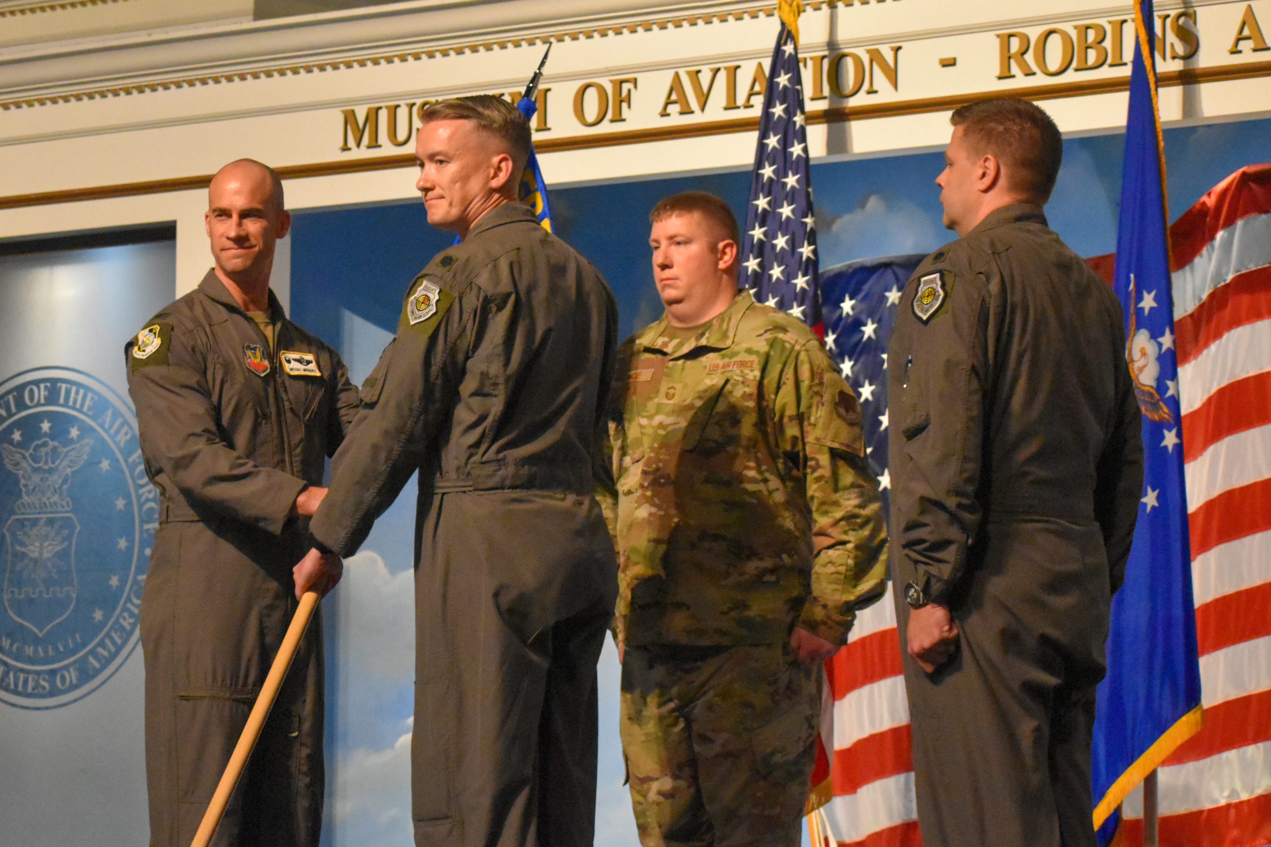 Lt. Col. Peter Johnson (center) and Col. Michael Middents (left) hold the guidon during a change of command ceremony at the Museum of Aviation on Friday, August 8. Johnson assumed the role from outgoing commander Lt. Col. C. Ryan Cox (right). (Brieanna Smith/HHJ)