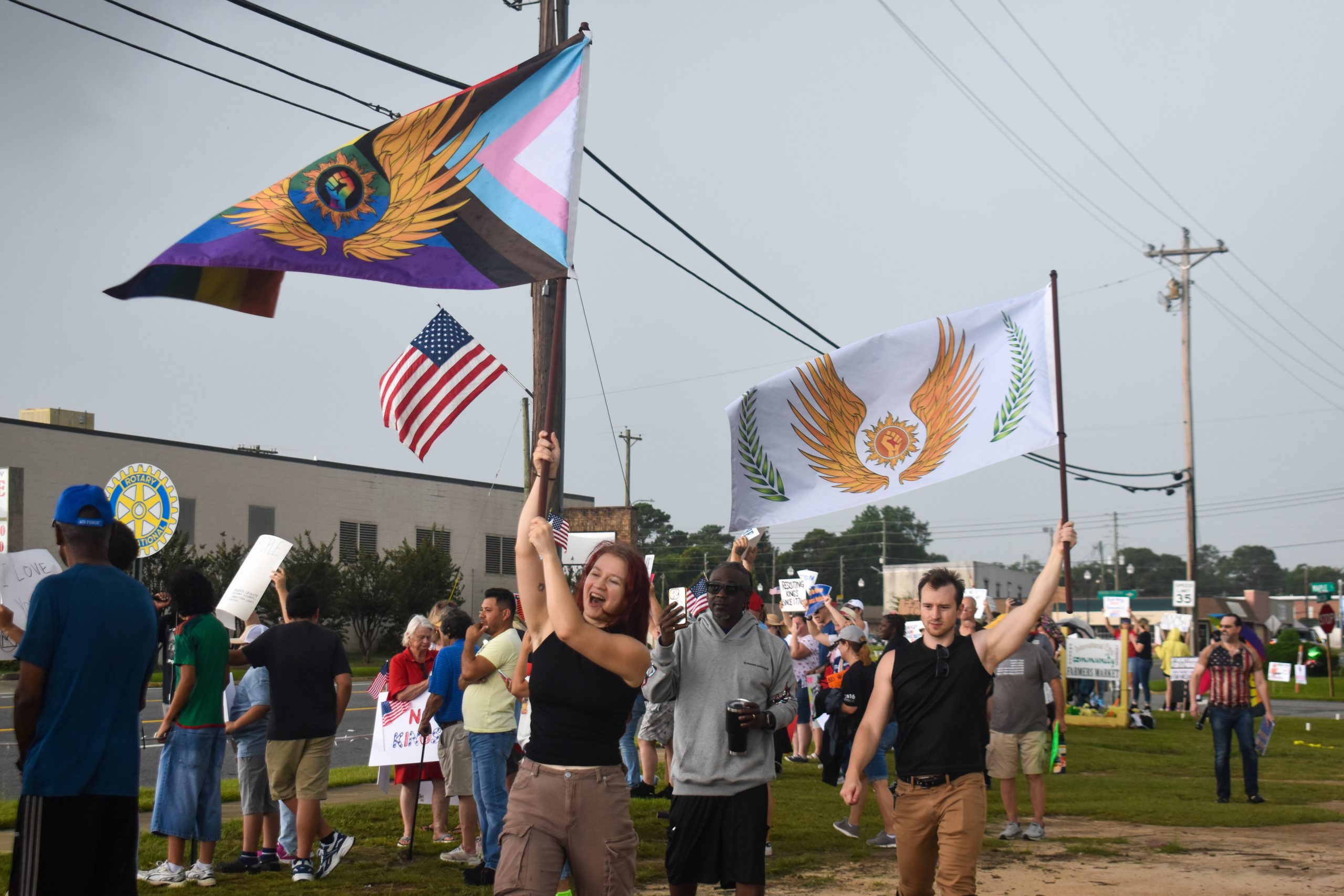 Protesters hold flags symbolizing the LGBTQ+ community and solidarity during the No Kings protest on Saturday, June 14. (Sandra Hernandez/HHJ)