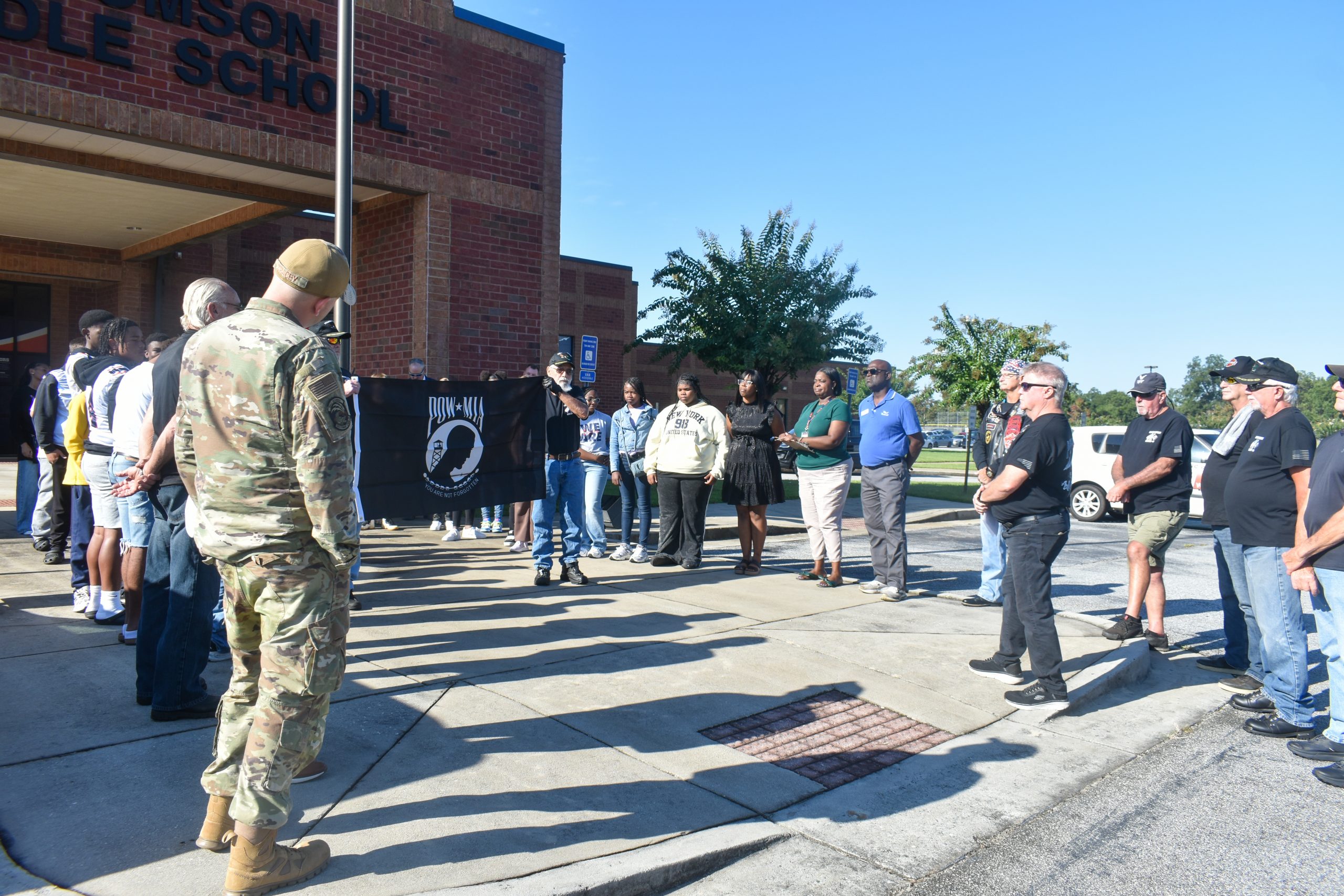 Rolling Thunder Georgia-3 members display the POW/MIA flag before hoisting it up the flagpole at Thomson Middle School during a ceremony on Wednesday, Sept. 3. (Brieanna Smith/HHJ)
