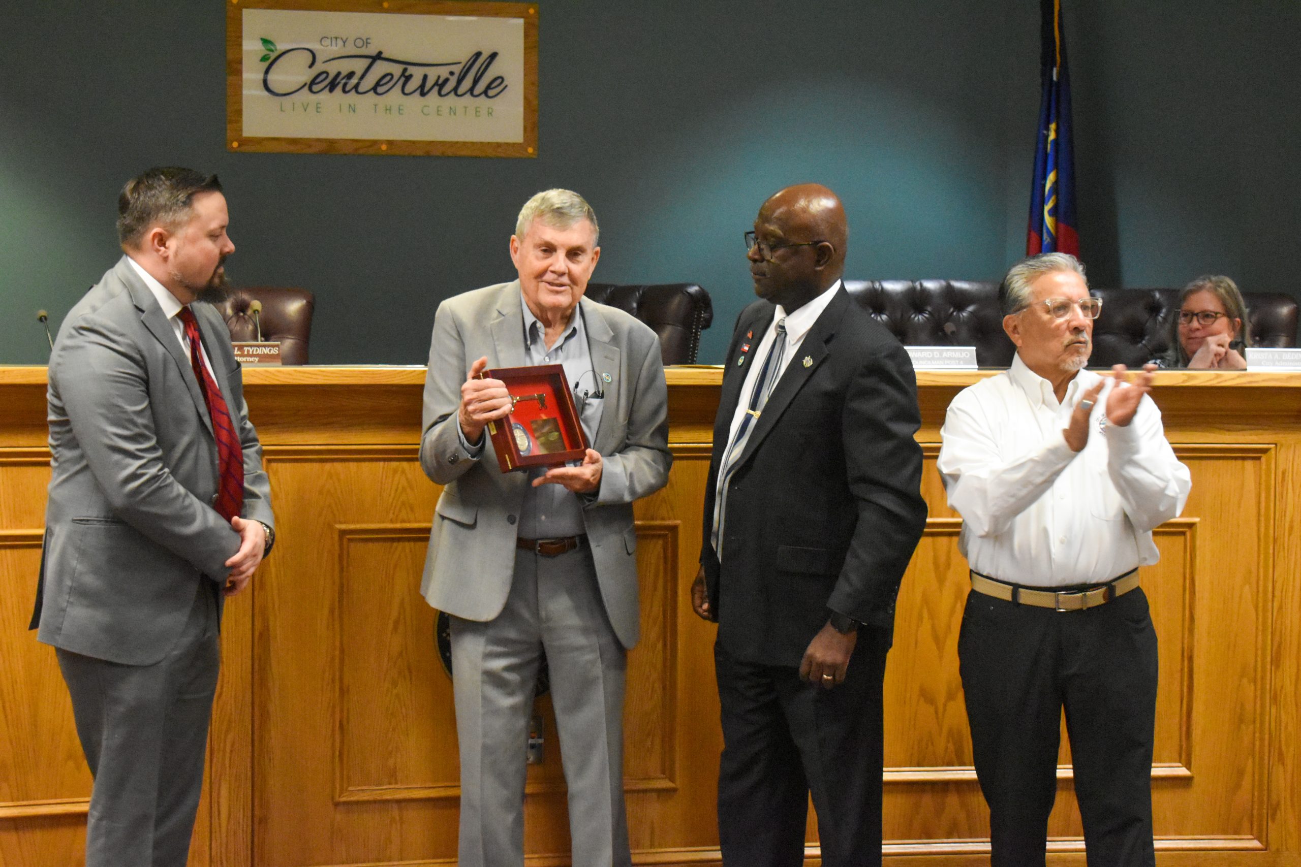 Centerville City Council honors former mayor John Harley with a key to the city during the city’s April 1 council meeting. (Brieanna Smith/HHJ)