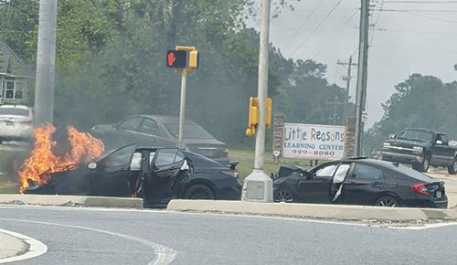 First responders assisted the occupants of the black Toyota Camry in exiting the vehicle before the car was totally in flames, and firemen from the Houston County Fire Department worked to douse the flames. The driver of the Honda Civic was transported to the hospital for care, although they were stable and alert while on scene. First responders left the scene at approximately 5:15 p.m.