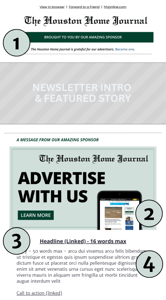 If ad content is inconsistent with the Houston Home Journal’s ad specifications, it will be returned to the advertiser for modification. If content is submitted late or incorrectly, the advertiser risks having their ad(s) not run, or run as is.