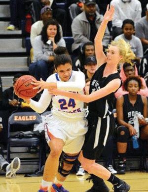 Deasia West of Houston blocked two shots late, but her team trailed by 10 15-5 going into the second. Naiasia Cole, taking on the double-teaming pressure, gave the visiting team the first points of the second. That was followed, however, by the home team’s 12-0 spurt. The steals came from Tamara Fann, Witherspoon and Galloway, and back-up forward Monica Beard scored 2 putting back a free throw.
