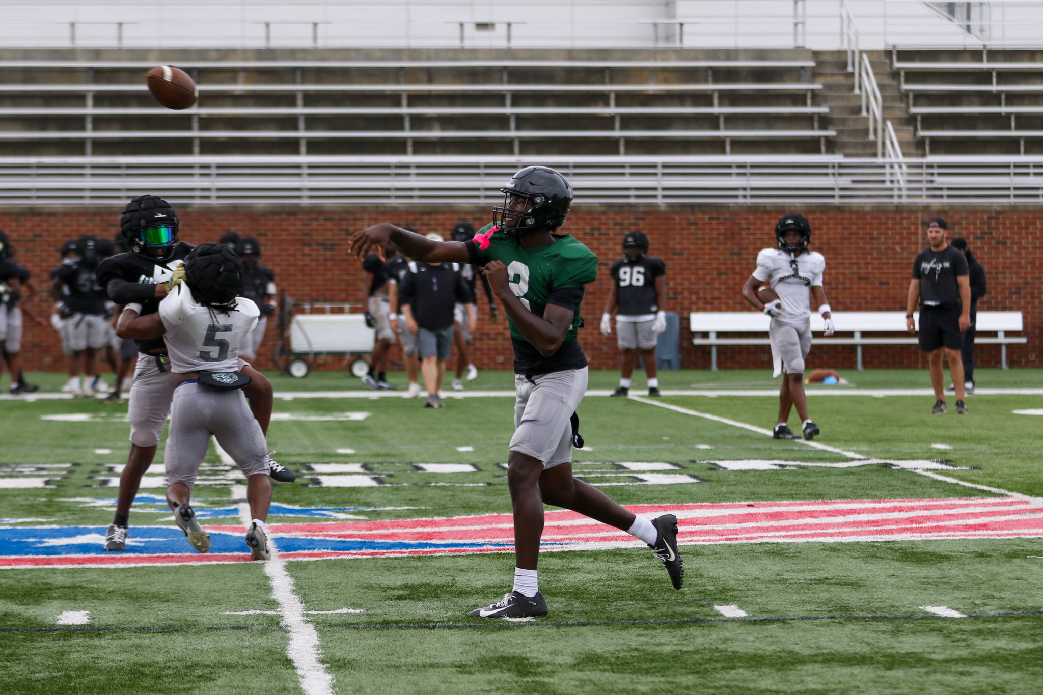 They did full contact 11-on-11 mock drives as well as more specialized work with each position group, often working together.