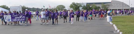 purple shirts walked a lap around the track. According to the