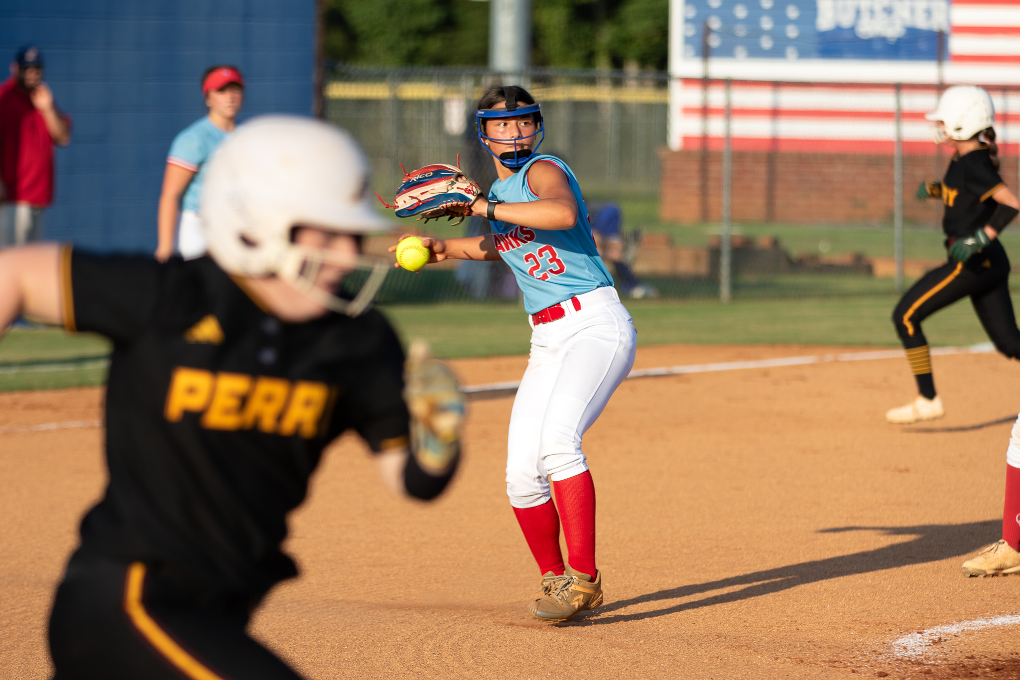 Caidence Scott (23) winds up for a throw to first base after fielding a short hit at the pitchers circle. She pitched two innings in the Lady Warhawks’ 13-5 final over Perry for their 14th win on the season. (Clay Brown/HHJ)