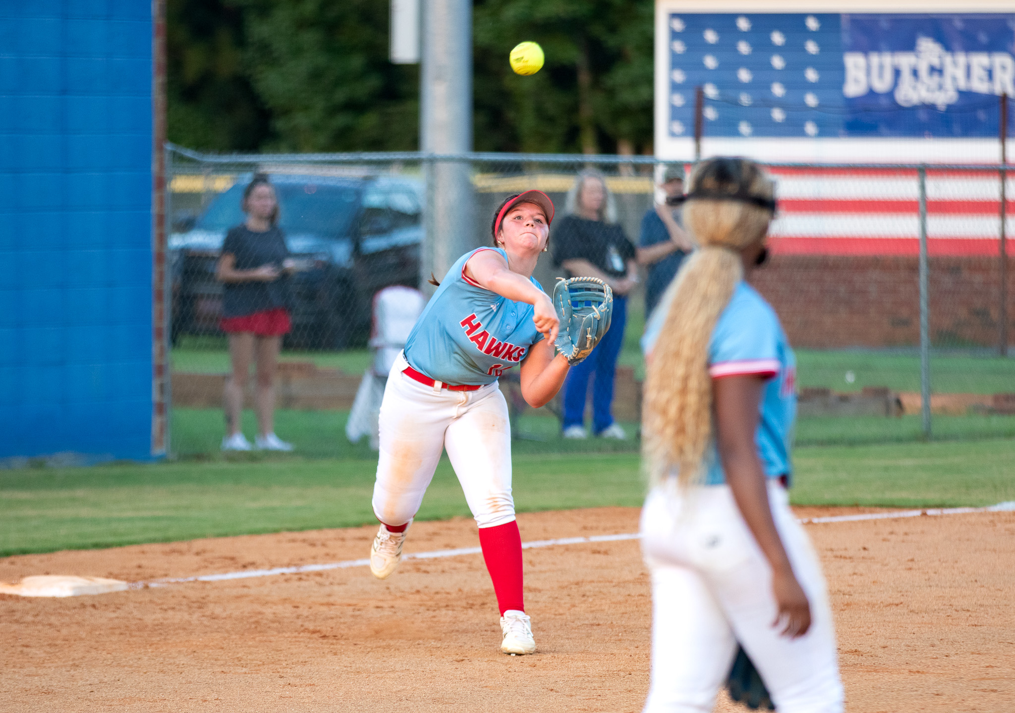 Hailey Maloney tosses the ball over to first base for an out. (Clay Brown/HHJ)
