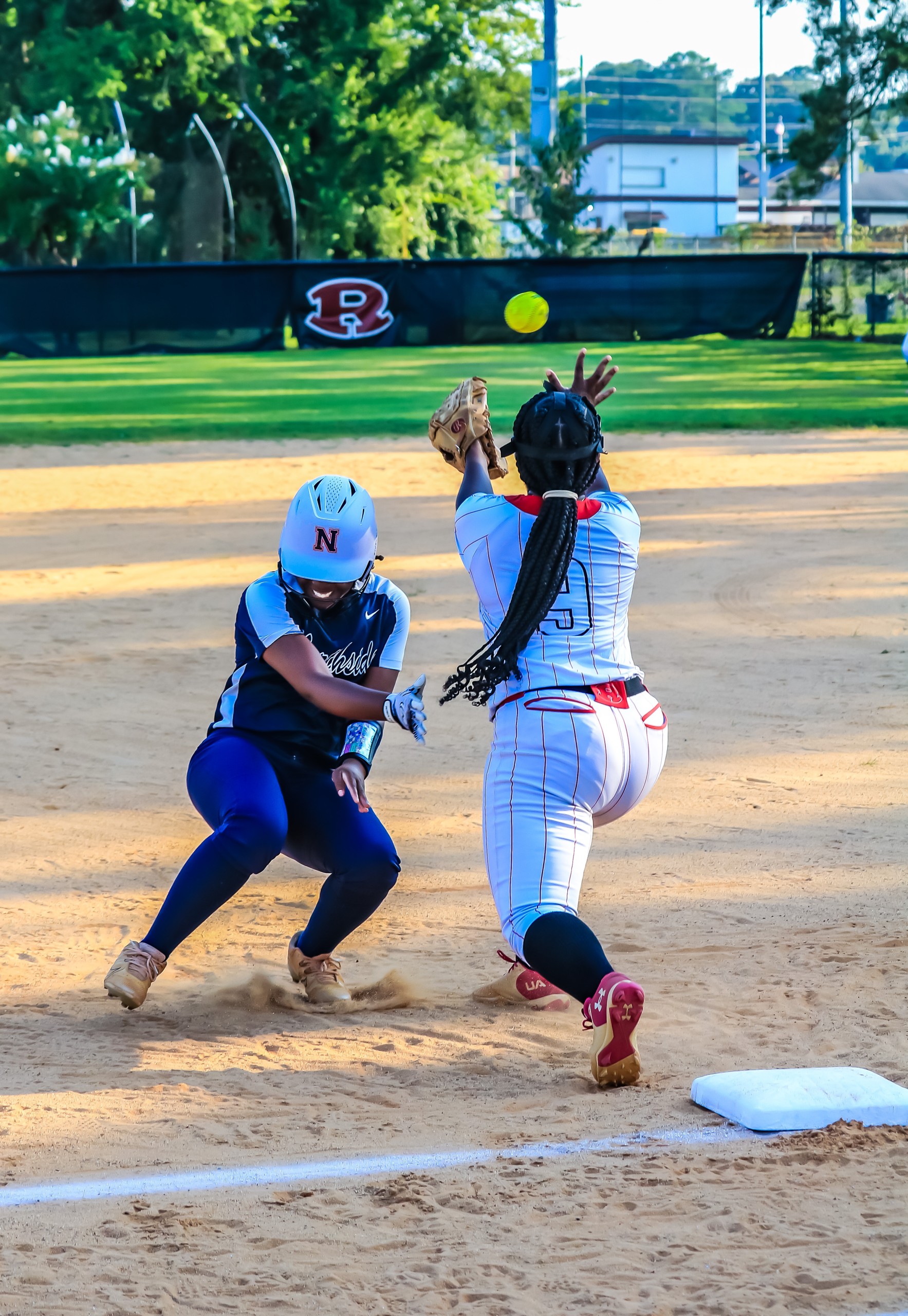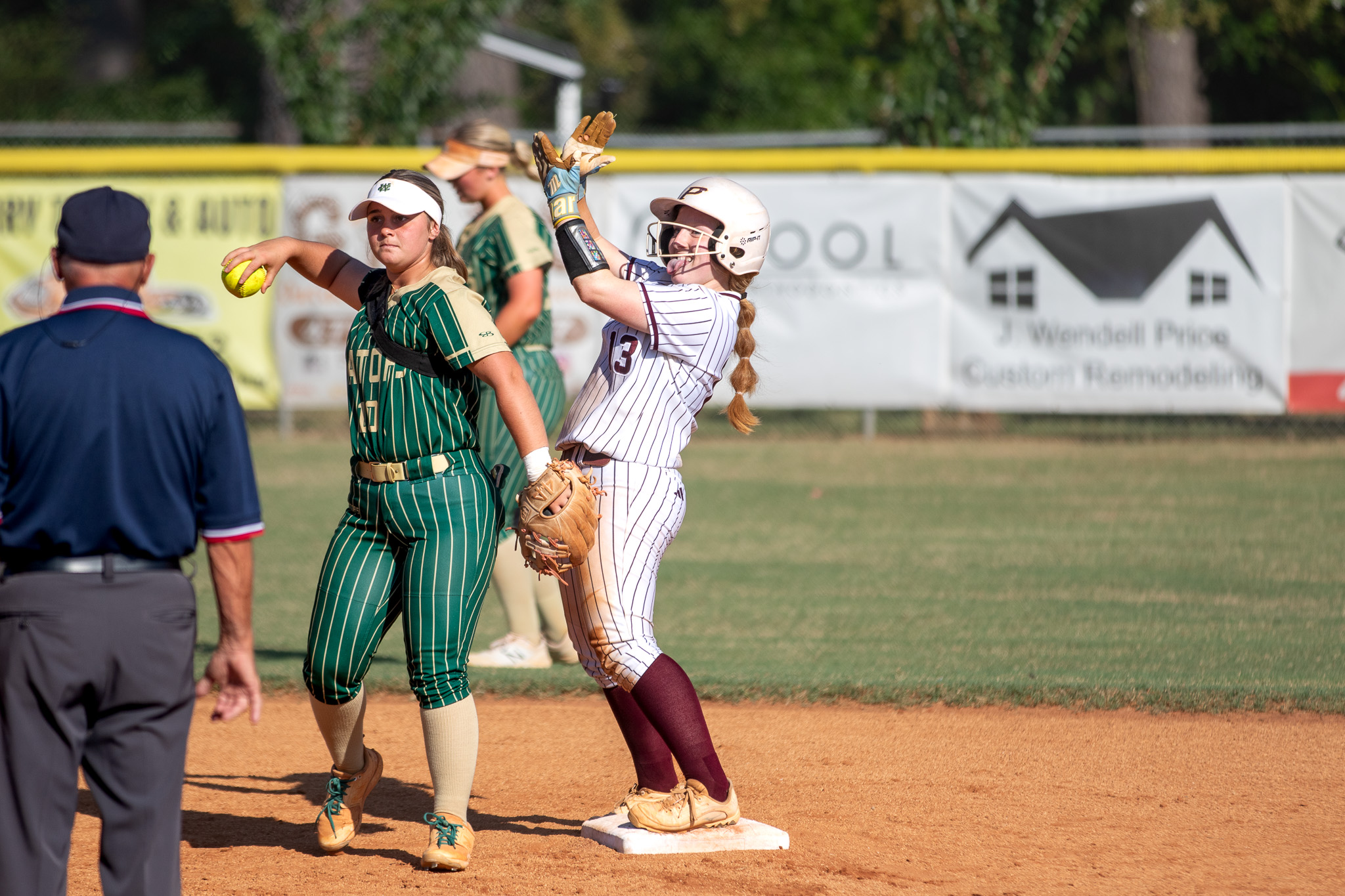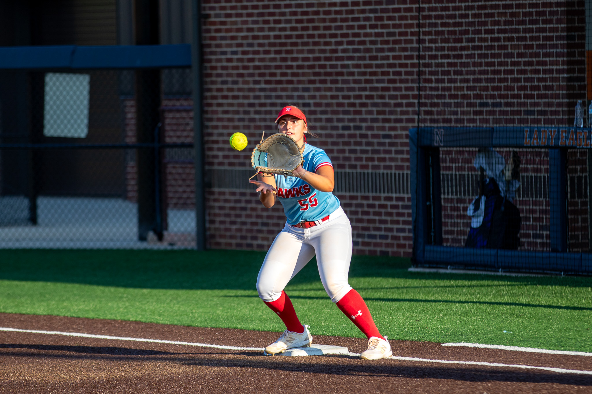 Veterans first baseman Katelyn Haines grabs a throw from the infield for an out during the Lady Warhawks’ region win at Northside. (Clay Brown/HHJ)