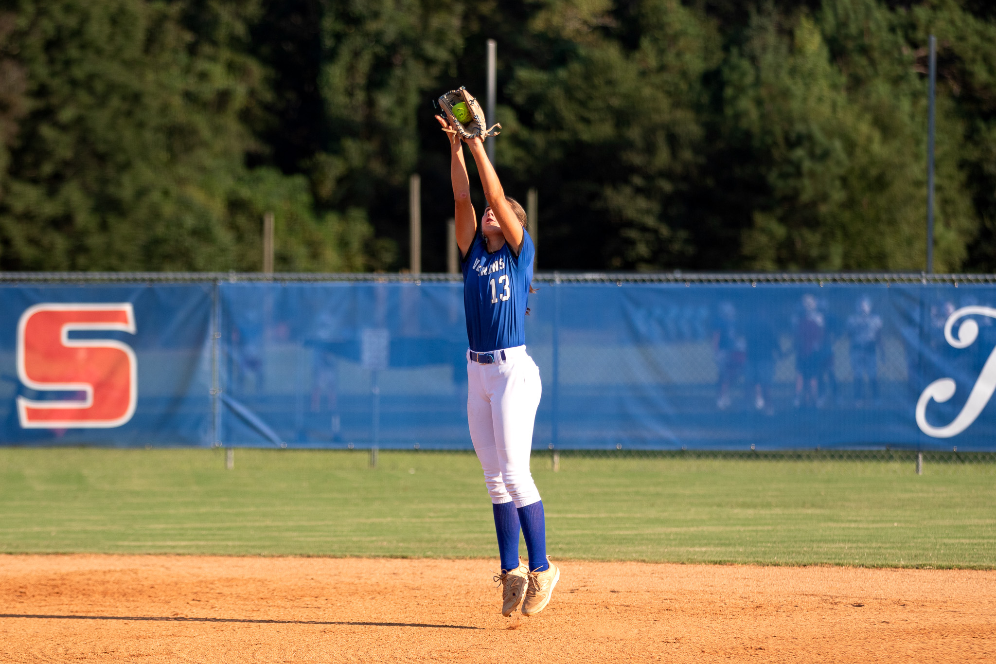 Veterans’ second baseman Kalleigh Stokes stretches up to grab the ball for an out during the Lady Warhawks’ win over Houston County. (Clay Brown/HHJ)