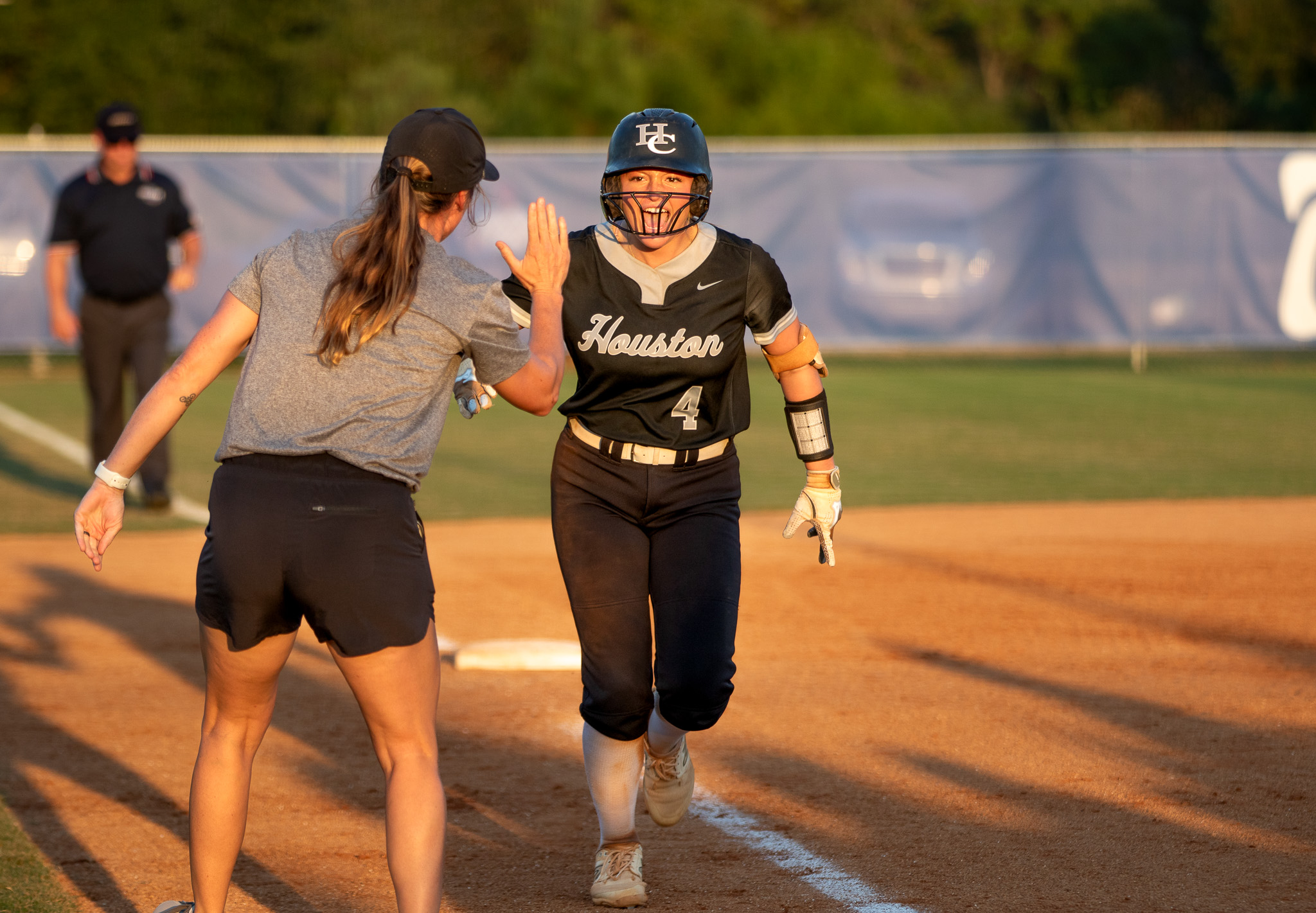 Ann Marie DeFore (4) high fives Houston County head coach April Collins (grey) after her solo jack in the fifth inning. The Lady Bears went on to lose Game 1 to Veterans 4-3. (Clay Brown/HHJ)