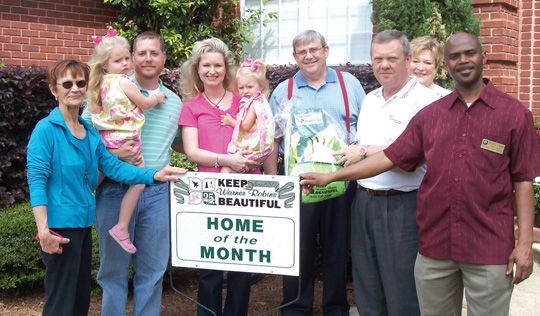 The home of Mr. and Mrs. Chris Bowie was selected by Keep Warner Robins Beautiful (KWRB) to receive the Home of the Month Award. Also pictured (left to right) are Brooke and Britton with KWRB members Mary Ealer, Bill Craig, David Carr, Willice Walters and Francis Wilson.