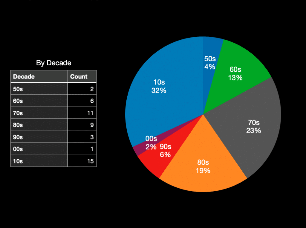 As expected, the most considerable portion by decade was the 2010s, reflecting my indie rock phase in college. Also most vinyls I’ve been gifted are newer, except “Revolver.” The ’70s came in second, the ’80s falling closely behind. My newest record was the Rocketman soundtrack from 2019; the oldest is a classical piece from 1957.