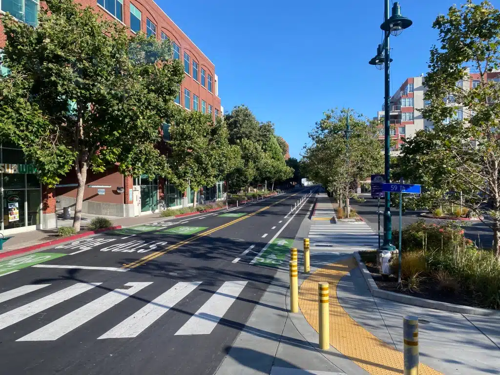 The last stretch of our train trip went through Sacramento, Davis, and eventually concluded in Emeryville, California. Davis is, of course, one of the top cities in the United States for bicycling, but even Emeryville had plastic bollard-protected lanes all over the place near the train station.