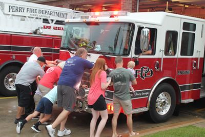 Families of the firefighters, citizens of Perry, and Mayor James Faircloth, along with some Council members were in attendance to support the fire station and help push in the new trucks. Once in, people began using shammys to wipe down the rain off the vehicle from early that morning.