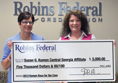 Robins Federal Credit Union is a proud sponsor of the upcoming Susan G. Komen Central Georgia Affiliate 2013 Komen Race for the Cure. The event will be held on Oct. 19 at North Peach Park in Byron. For more information on the event visit www.komencentralga.org. Hillary Bobbitt, marketing specialist for Robins Federal Credit Union, presents sponsorship check to Emily Bowden, executive director for Susan G. Komen Central Georgia affiliate.