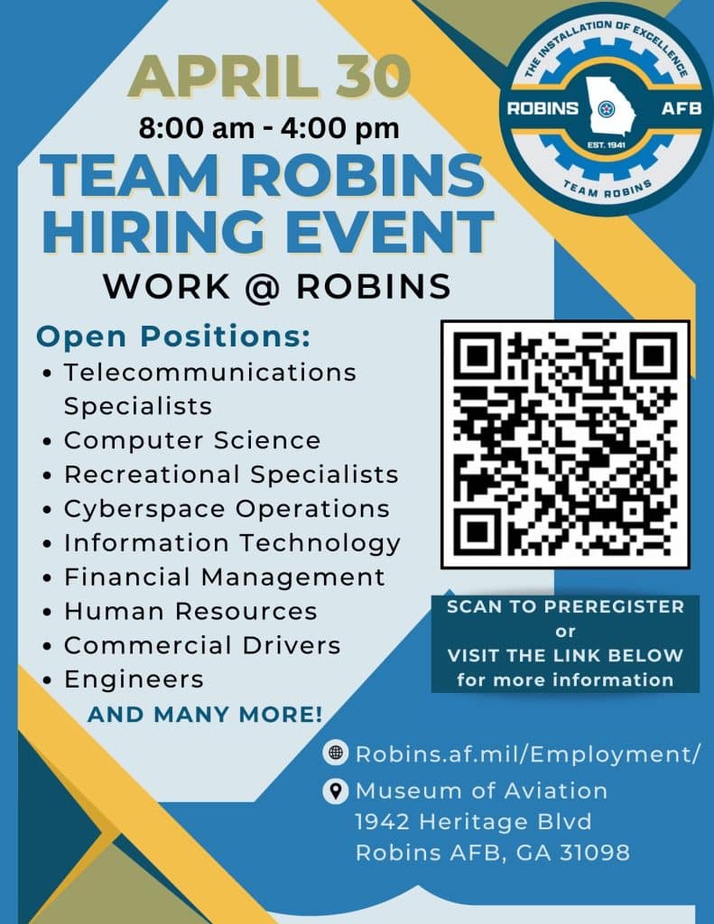 WARNER ROBINS—Are you interested in a fulfilling career at Robins Air Force Base? The installation will make it straightforward to apply at the Team Robins Hiring Event on April 30 at the Museum of Aviation, designed to encourage and motivate potential job seekers.