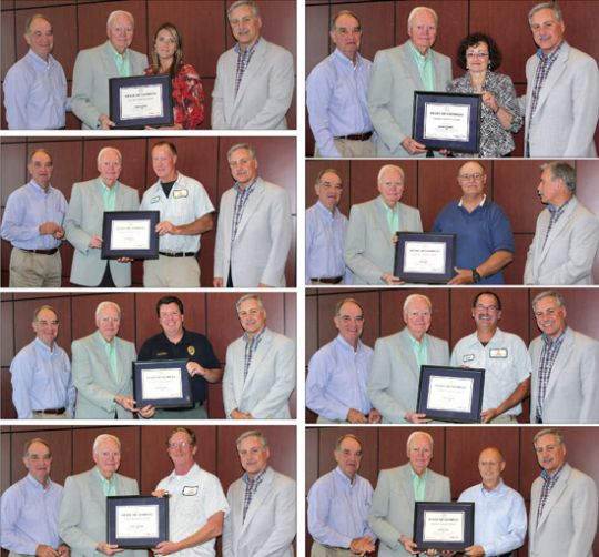The following individuals received the Faithful Service Award. (Note: In addition to the employee, the other individuals included in each photo are, from left to right, Foster Rhodes, Georgia Agricultural Exposition Authority Vice Chairman; James E. Sutherland, Georgia Agricultural Exposition Authority Chairman; and Randy Moore, Georgia National Fairgrounds & Agricenter Executive Director.)