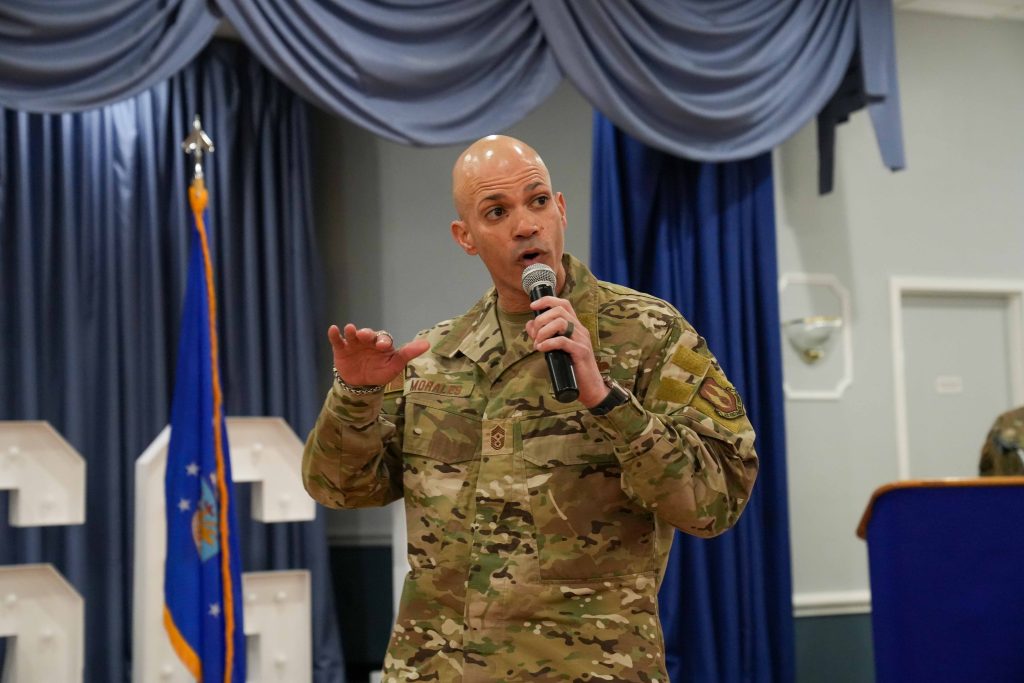 Chief Master Sgt. Lloyd Morales, 78th Air Base Wing command chief, makes opening remarks at a senior master sergeant release party at Robins Air Force Base, Georgia, March 14, 2025. Morales stressed the importance of Air Force values to the Airmen at the event. (U.S. Air Force photo by Lauren Boggs)