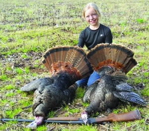 Lily Chapman, 9, was on her first turkey hunt with a single shot 20 gauge at 30 yards. One of the birds had a five-inch beard and the other had a six-inch beard. Her parents are Jamie and Stephanie West Chapman.
