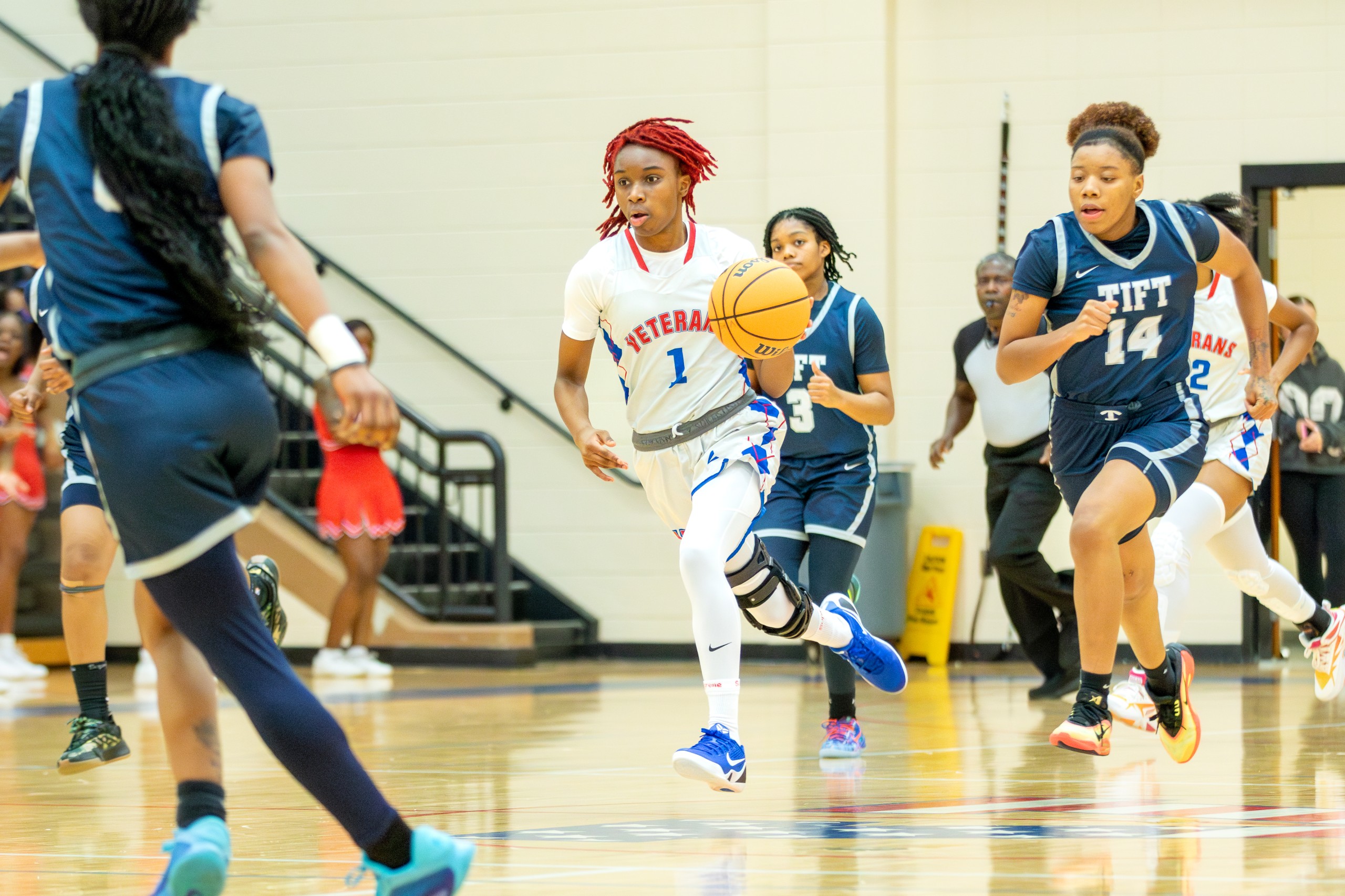 Kiersten Rogers (1) gathers for a layup in transition during Veterans’ region win over the Lady Yellow Jackets. (Clay Brown/HHJ)