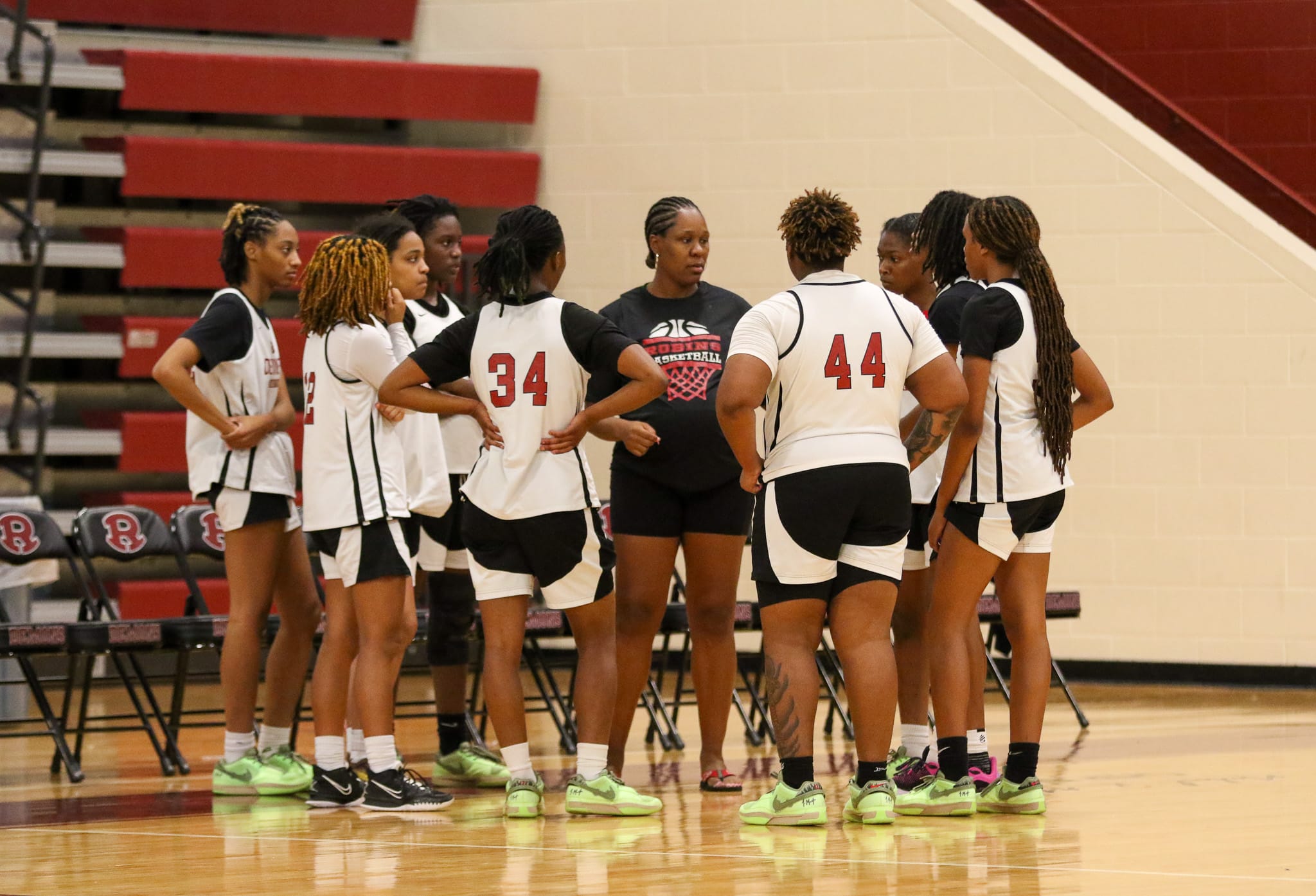 Demonettes coach Rebecca White (black) talks over the game plan in a time out during Tuesday’s scrimmage. (Clay Brown/HHJ)