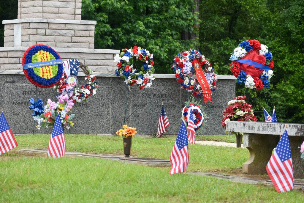 Several wreaths stand on display after a ceremonial wreath laying at the Warner Robins Memorial Day Ceremony on Monday, May 26. (Brieanna Smith/HHJ)