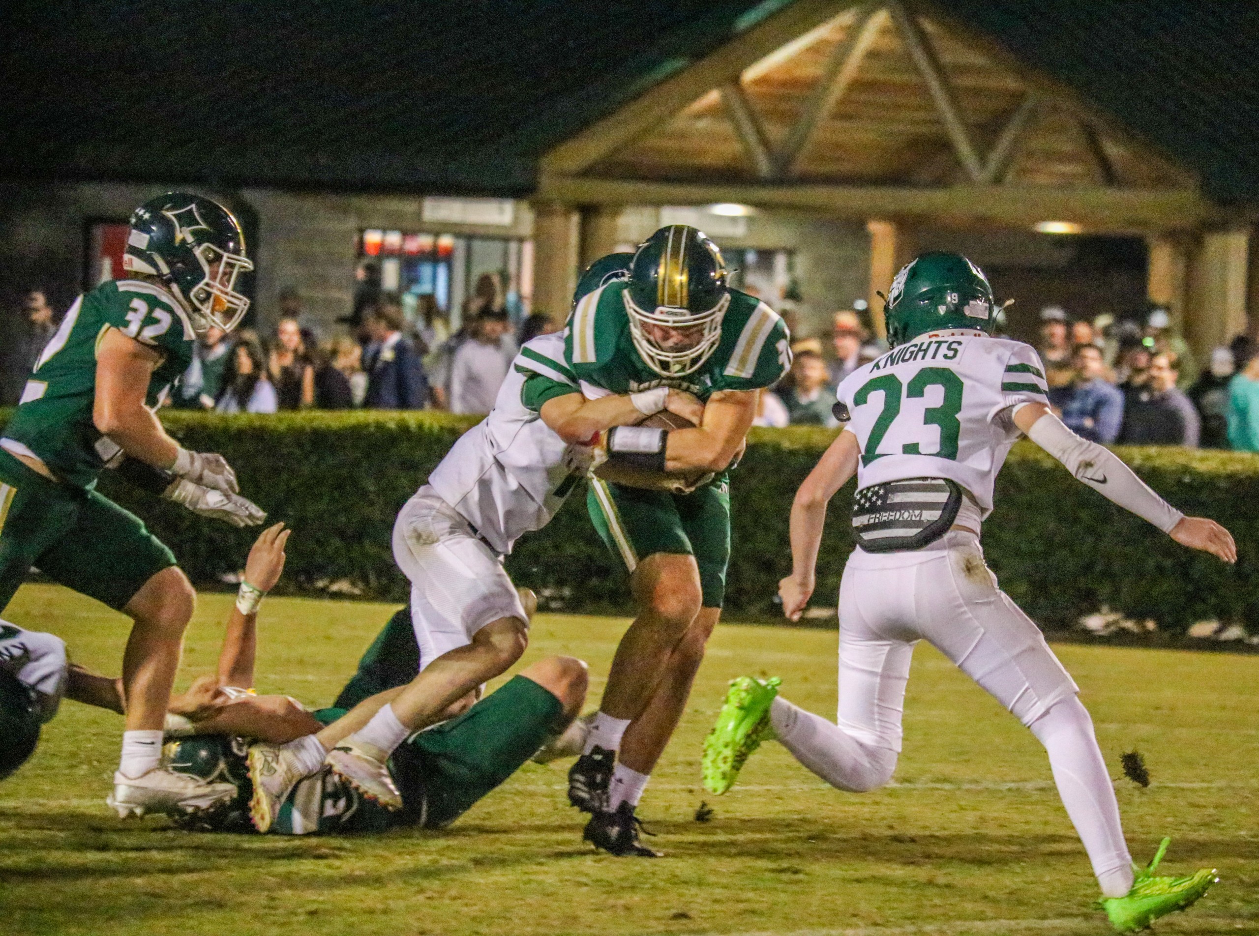 Calvary Christian defenders close in on a Westfield ball carrier. (Michael Hardison Jr/HHJ)