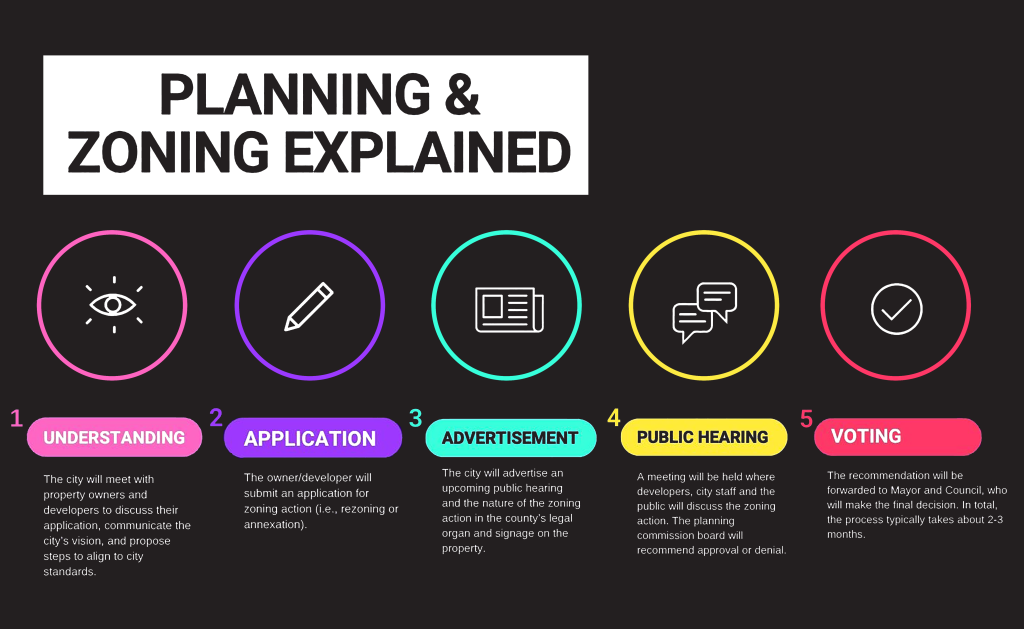 - The city will advertise the zoning action in the county’s official legal organ and post signage on the property. This will explain the nature of the action and provide details about the public hearing.