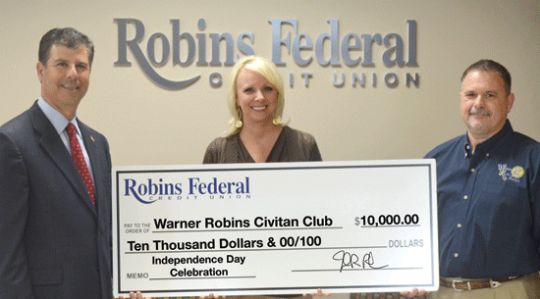 Robins Federal Credit Union recently renewed its sponsorship of the annual Independence Day celebration in Warner Robins. Robins Federal Credit Union presented the Warner Robins Civitan Club with a sponsorship check for $10,000. This year’s celebration will take place at McConnell-Talbert Stadium on July 3 and will include performances by Bobbie Eakes and The Band of the Air Force Reserve, as well as, the southern rock band Stillwater. This will be the last performance for the Air Force Reserve Band. These performances will be followed by a fireworks show. Robins Federal Credit Union has sponsored the Independence Day event since 2002. Tammy Stewart, assistant vice president for Robins Federal Credit Union, presents a check to Mayor Chuck Shaheen and Allen Tatman, Project Chairman with Warner Robins Civitan.
